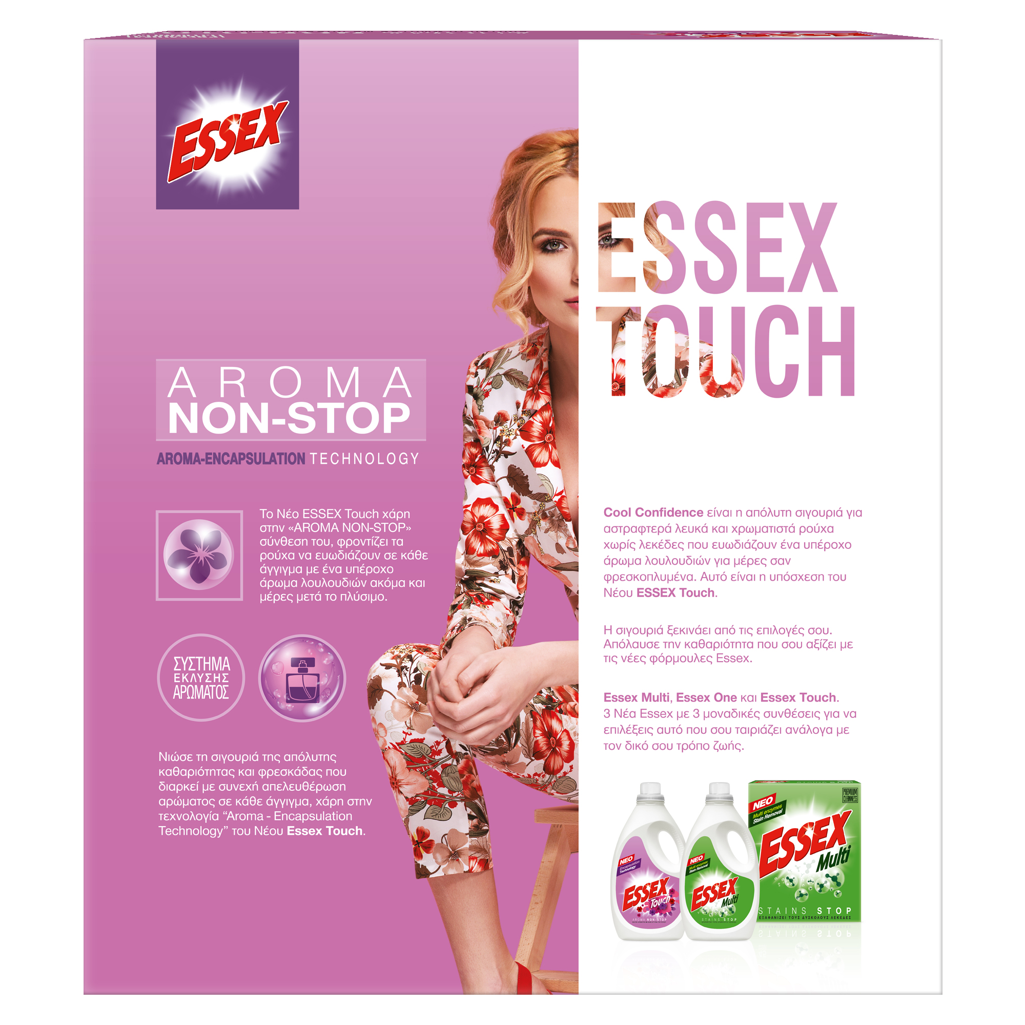 Thanks to its ‘AROMA NON-STOP’ formula, ESSEX Touch makes your clothes smell like a delightful bouquet of flowers with every touch, even days after washing. Experience the confidence of absolute cleanliness and freshness with the new ESSEX Touch that lasts, thanks to the ‘Aroma-Encapsulation Technology’ for continuous fragrance release with every touch!