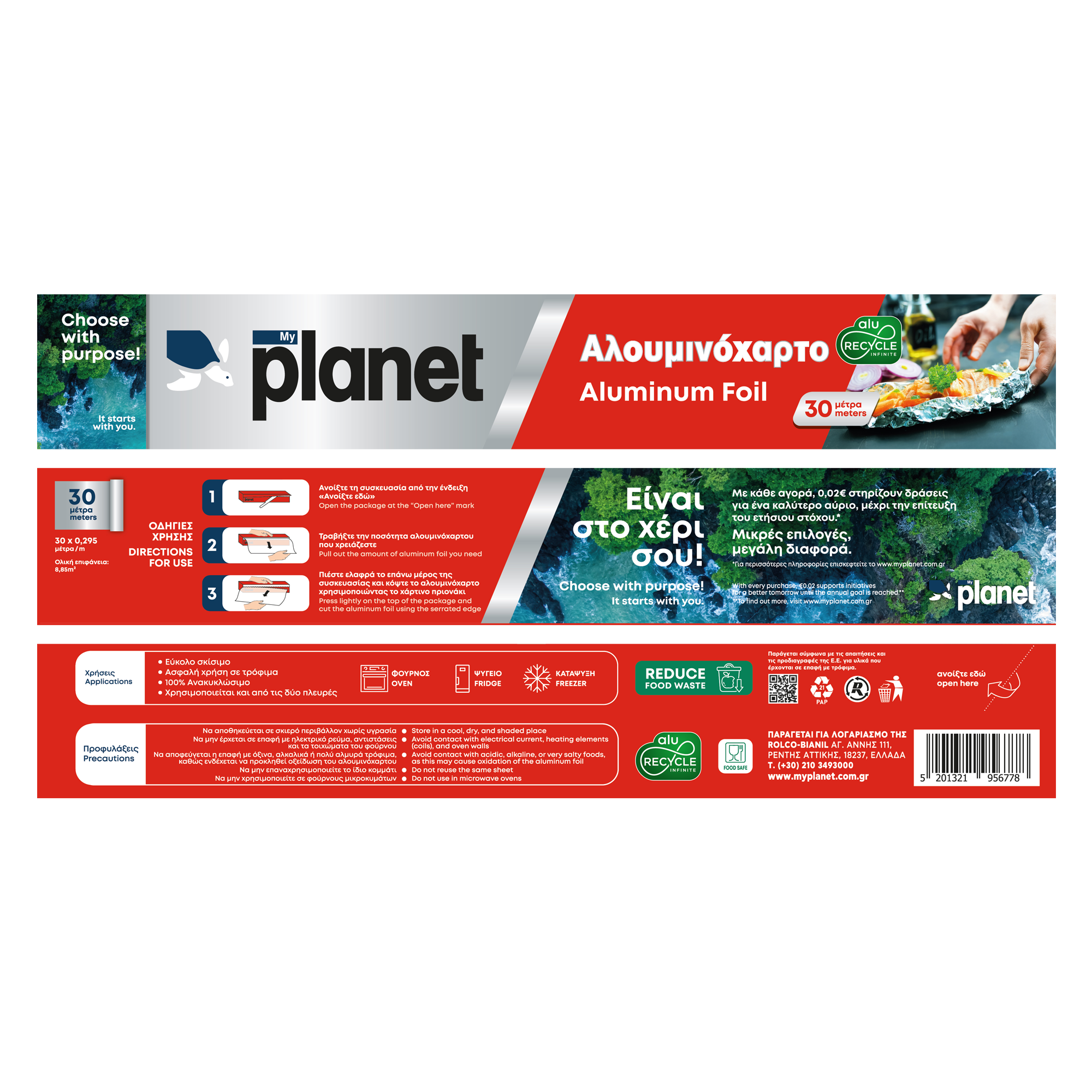 Το αλουμινόχαρτο MyPlanet συνδυάζει την εγγυημένη αντοχή με την απόλυτη προστασία, προσφέροντας 30 μέτρα υψηλής ποιότητας για κάθε ανάγκη μαγειρέματος, ψησίματος ή φύλαξης τροφίμων στην κουζίνα σας. Διατηρεί αναλλοίωτη τη φρεσκάδα, τα αρώματα και τη γεύση των γευμάτων σας, ενώ παραμένει μια 100% ανακυκλώσιμη επιλογή που καταργεί τον συμβιβασμό ανάμεσα στην αποτελεσματικότητα και τη βιωσιμότητα. Είναι στο χέρι σου! Με κάθε αγορά, 0,02€ στηρίζουν δράσεις για ένα καλύτερο αύριο, μέχρι την επίτευξη του ετήσιου στόχου.