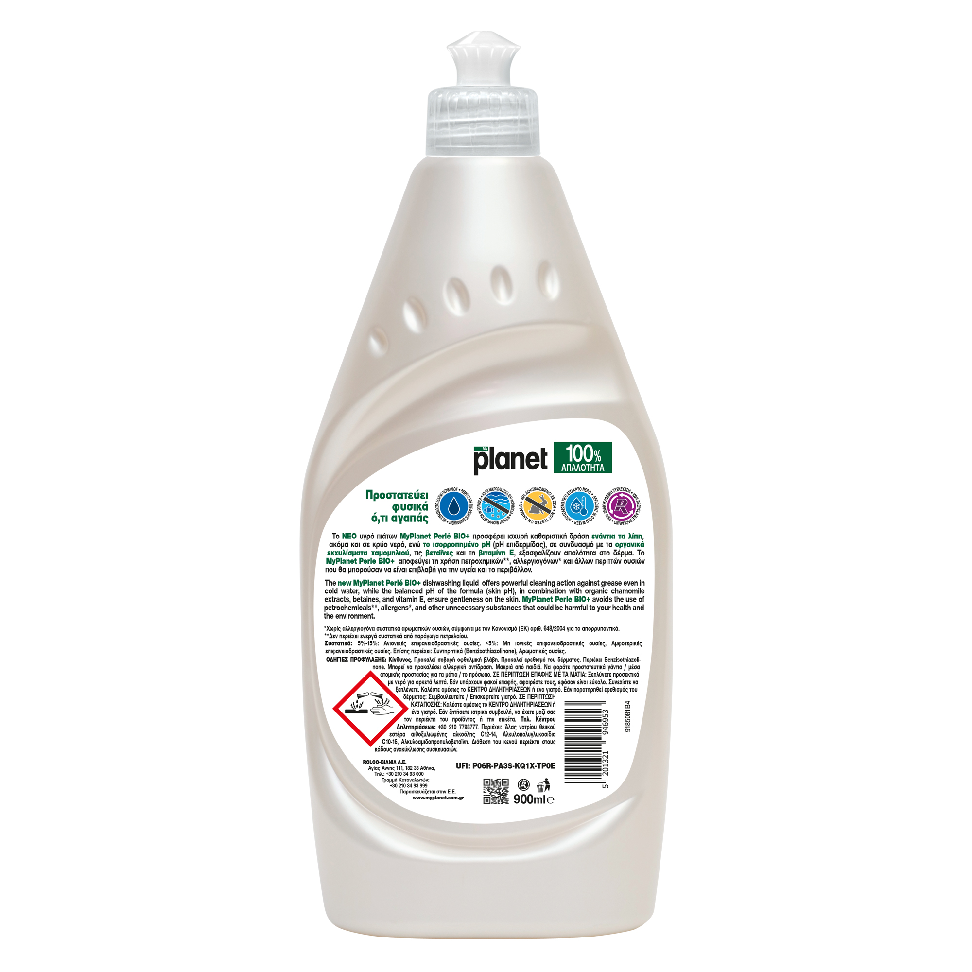 Το ΝΕΟ MyPlanet Perle BIO+ υγρό πιάτων προσφέρει ισχυρή καθαριστική δράση ενάντια τα λίπη, ακόμα και σε κρύο νερό, ενώ το ισορροπημένο pH (pH επιδερμίδας), σε συνδυασμό με τα οργανικά εκχυλίσματα χαμομηλιού, τις βεταΐνες και τη βιταμίνη Ε, εξασφαλίζουν απαλότητα στο δέρμα. Το MyPlanet Perle BIO+ αποφεύγει τη χρήση πετροχημικών, αλλεργιογόνων και άλλων περιττών ουσιών που θα μπορούσαν να είναι επιβλαβή για την υγεία και το περιβάλλον.